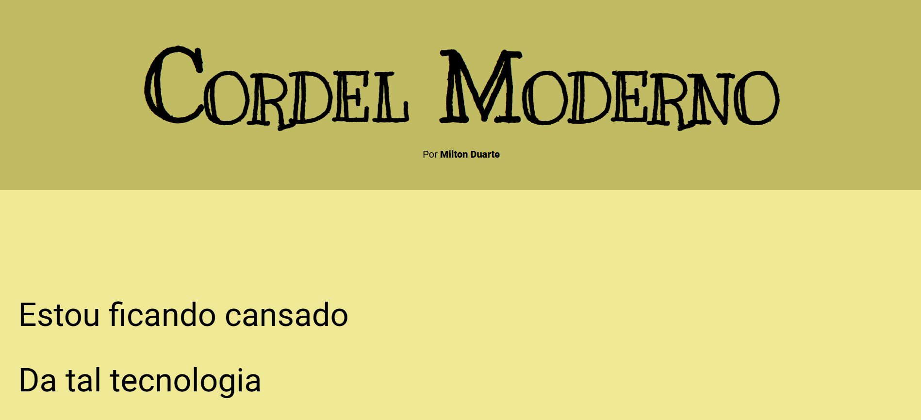 O site apresenta um layout inspirado na literatura de cordel, utilizando imagens, efeitos de parallax e tipografia característica. O conteúdo, o design e a responsividade foram desenvolvidos de acordo com os ensinamentos do curso, proporcionando uma ótima experiência tanto em computadores quanto em celulares.