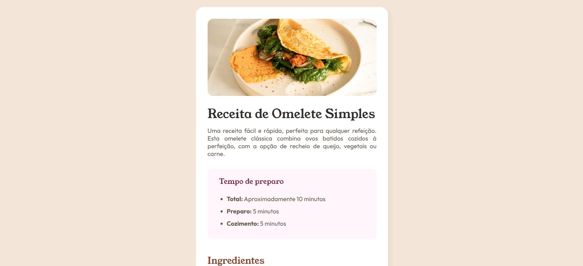 Aplicação simples e responsiva que exibe uma página de receitas com ingredientes, modo de preparo e informações adicionais.